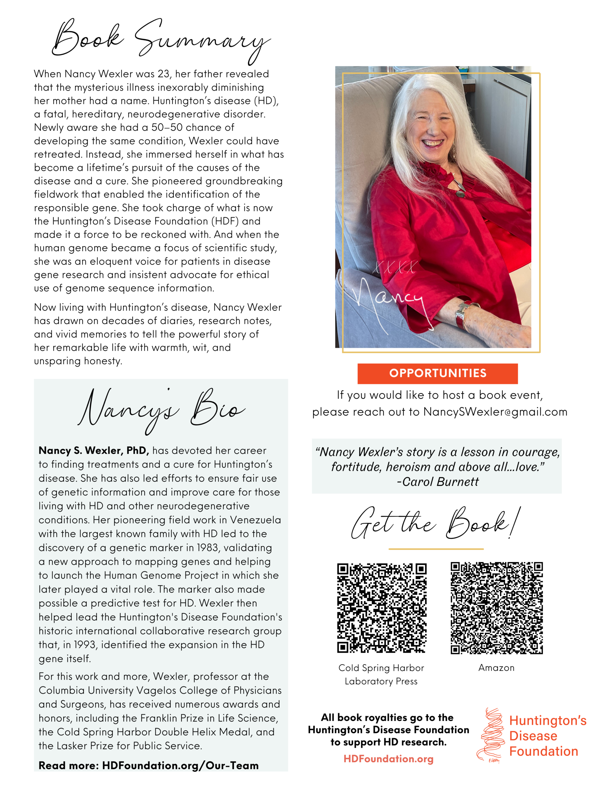 We invite you to explore the extraordinary life of Nancy S. Wexler through her newly released memoir, My Life, My Science: Pursuing a Cure for Huntington’s Disease, where she draws on the decades of diaries, research notes and vivid memories to tell the powerful story of her remarkable journey with warmth, wit and unsparing honesty.